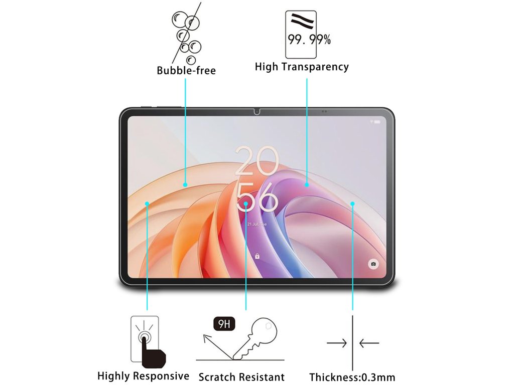 Pro největší možnou ochranu je vhodný protector z temperovaného skla - je plně průhledný, pevný (neohebný) a v případě prasknutí se nerozpadne na jednotlivé části, ale drží pohromadě a stále chrání displej. Plně ochrání displej před poškozením ostrými předměty (např. nožem) a disponuje oleofobním povrchem, takže se tablet stále dobře ovládá.